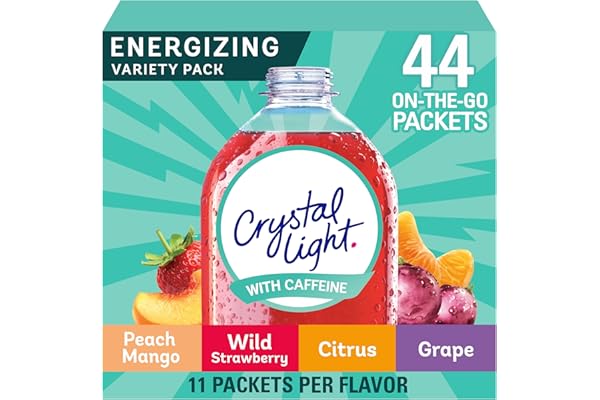 › Crystal-Light-Citrus-CaffeineCrystal Light Sugar-Free Energy Citrus On-The-Go Powdered ... Ten 0.09 oz. packets of Crystal Light Naturally Flavored Citrus On-The-Go Powdered Drink Mix with Caffeine ; 60 mg. of caffeine per packet for a boost of energy ; Powdered citrus fruit drink mix packets are small and easy to pour for on-the-go convenience ; Individual packets ideal for adding orange flavor to a standard 16.9 fl. oz water bottle